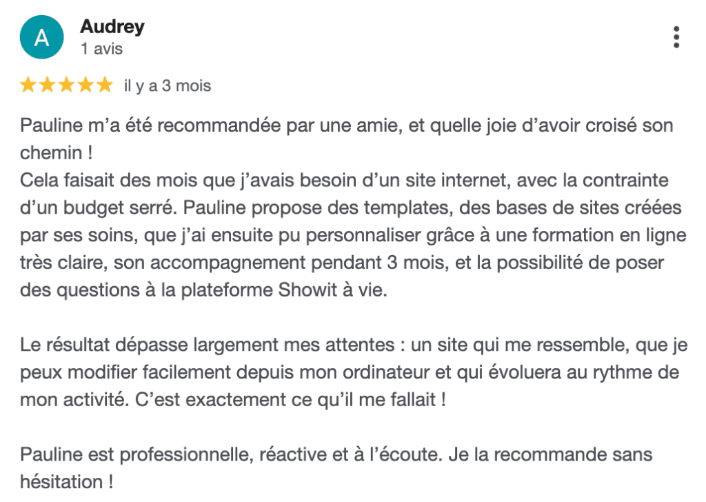 Que ce soit par moi (durant 3 mois en illimité) ou l’équipe Showit (de vrais humains répondent à tes questions, ainsi nous ne sommes jamais seuls en cas de problèmes) !